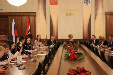 Здесь можно задать вопрос о наболевшем. Но только нужно получить такую возможность. Итак, школьники из пресс-центров города Новосибирска получили такую возможность встретиться с А. Б. Парфеновым, который рассказал о Конституции как основном законе государства. И задать вопросы не только Любови Михайловне, но и другим участникам конференции, депутатам Законодательного собрания.